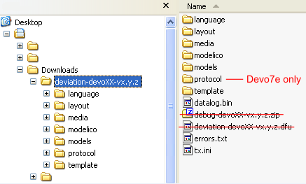 以前のDeviationリリースからアップグレードする場合は、機体モデルのメモリデータや送信機の設定を失う可能性があるため、送信機から「models」ディレクトリをバックアップし「tx.ini」ファイルおよび「hardware.ini」ファイルを変更しないことを強くお勧めします。