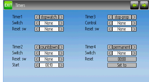 The ‘permanent’ timers are similar to an odometer and have their values saved in the model.ini file. They will maintain their previous value when powering up the transmitter. You can set the timer by using the ‘Set to’ button and reset by pressing the ‘Reset’ button.