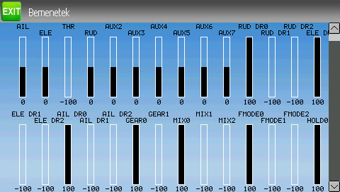 A bemenetek képernyőn lehet a bemenetek aktuális állapotainak megfelelő értékeket megtekinteni. Az értékek százalékos formában jelennek meg, ahol a teljes tartomány -100%-tól +100%-ig terjed.