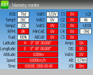 テレメトリー機能はRSSIと電圧アラームをサポートします。RSSIフィールドに報告される信号強度とVOLT1のバッテリー電圧の表示はFrskyテレメトリー画面を使用します。Bugs3 Mini受信機は良好 / 警告 / 低電圧を報告するのみとなります。これは良好の場合は8.40V、警告の場合は7.10V、低電圧の場合は6.40VのVOLT1値に変換されます。