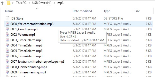 Each file is named to correspond to DFPlayer MP3 file name convention, which requires a 4-digit number as the first four characters of the filename, and a filetype of MP3 (ex: 0000.MP3 or 0000Welcometodeviation.MP3). MAC users should be aware of special file handling requirements as detailed on the DFRobot page.
