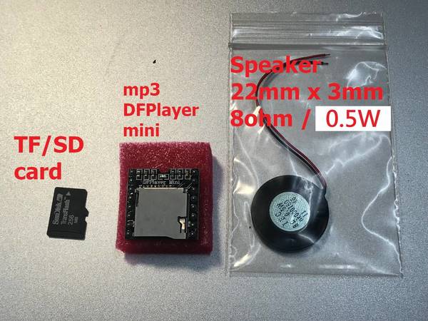 The DFPlayer module can be powered by 3.3v to 5v, with 4.2v recommended. A fully charged 1S, 3.6v lipo provides adequate voltage. At full volume the board may use 70ma+ momentarily, and in standby it is rated at 20ma. In testing, a 200mah 3.6 lipo lasted over two weeks of regular use (15-20 min/day).
